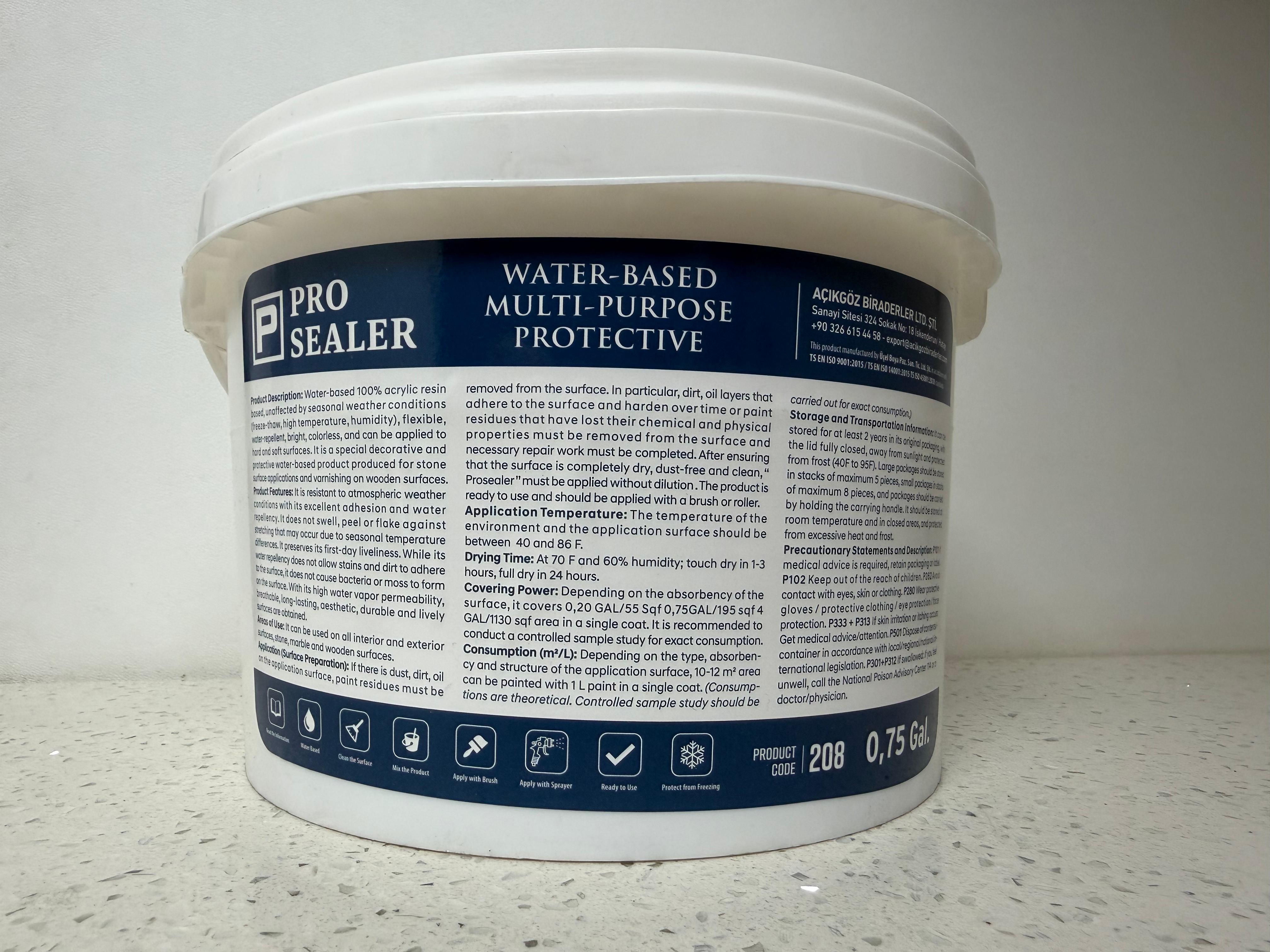 Water-based 100% acrylic resin based, unaffected by seasonal weather conditions (freeze-thaw, high temperature, humidity), flexible, water repellent, bright, colorless, and can be applied to various surfaces. It is a special decorative and protective water-based product produced for stone surface applications and varnishing on wooden surfaces.
